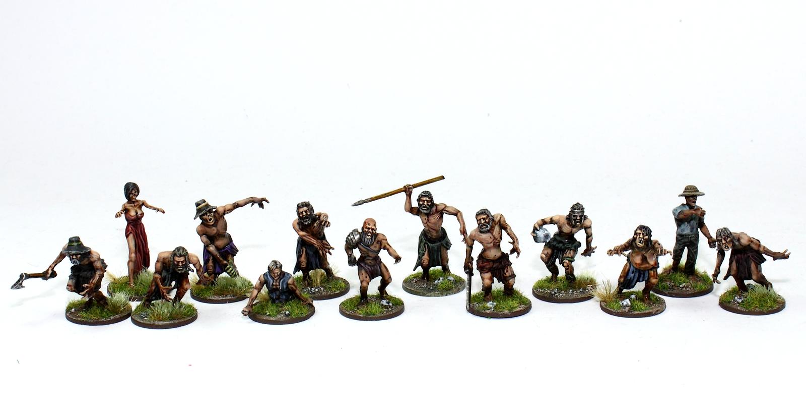 The above oddities consist of bits from Mantic's zombies, Wargames Factory's zombies and 'zombie vixens', some hats from ACW and ECW kits, Gripping Beast Dark Age Warriors, and even some bits from Warlord's Roman legionnaires. All of that, plus a bunch of green stuff to cover up missing flesh on the zombie parts. These here are supposed to be baddies from beyond the known parts of the woods. Odd poses (mostly thanks to Mantic's expressively posed zombies) or some inconsistencies in limb lengths aren't much of a problem on these guys.